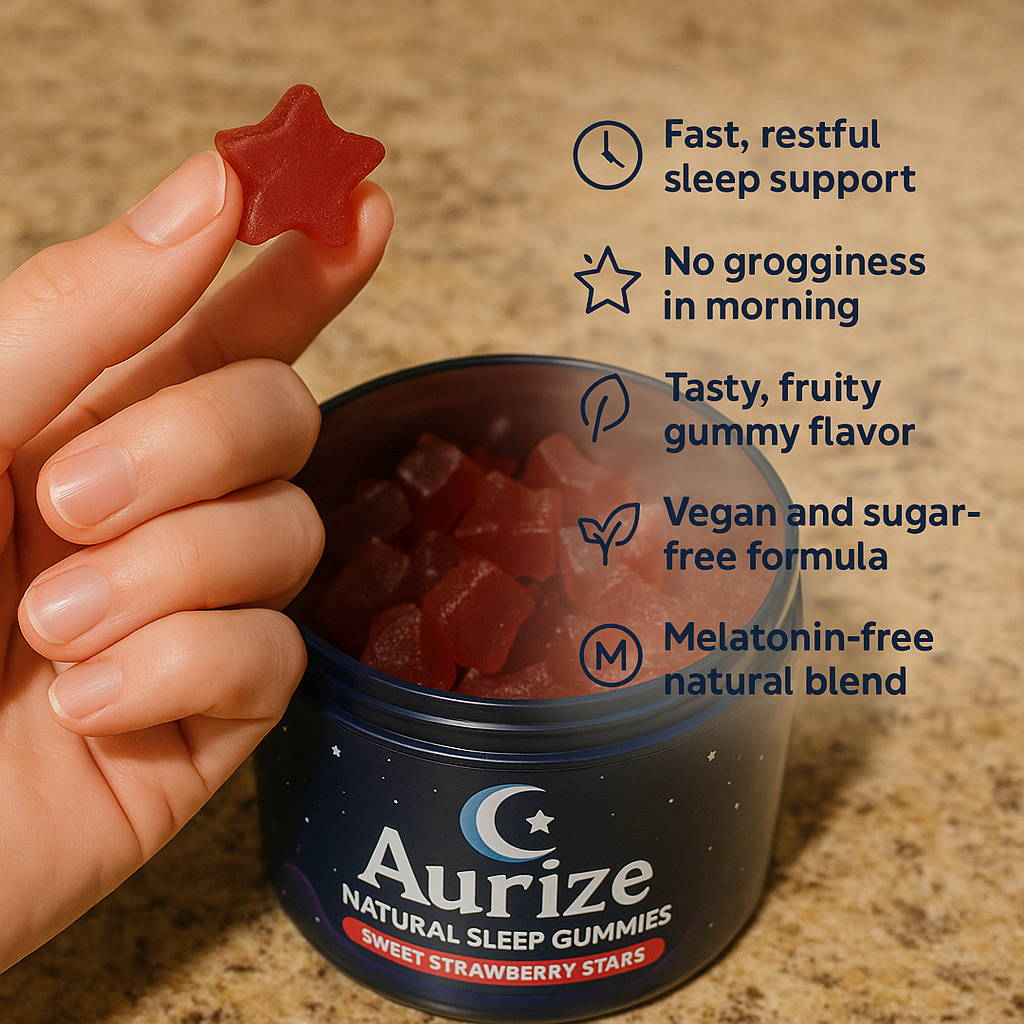 Aurize gummies combine a naturally calming blend of sleep-enhancing ingredients with a delicious strawberry flavor to help you unwind and fall asleep faster. Their exclusive formula supports deep, restorative REM sleep, so you wake up feeling recharged, clear-headed, and ready to take on the day.